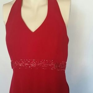 David's bridal size 4 formal bridesmaid, prom, homecoming or special occasion dress. Halter top style that buttons around neck. Zipper back. Color burgundy