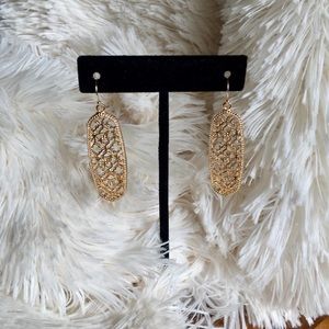 A lovely scrolled pattern in an oblong shape, measuring about 2” of a drop. Gold tone color. Pairs well with any outfit.