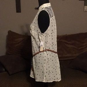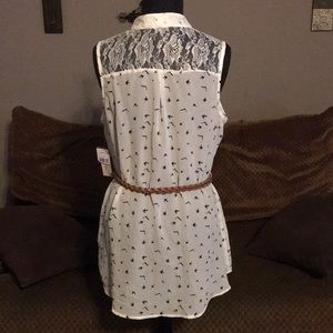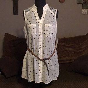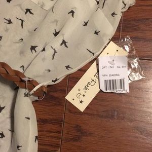 Adorable brand new sheer top with little birds all over and a cute braided belt. Lace accents across the back top area. Size large, measures 20” armpit to armpit and 28” long from shoulder to bottom laying flat