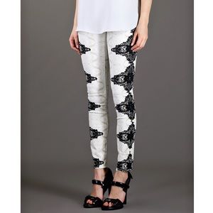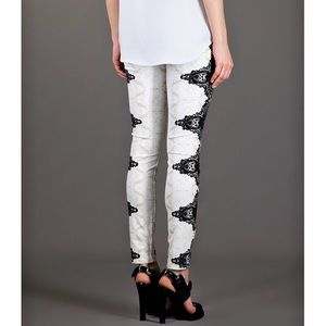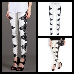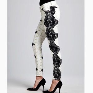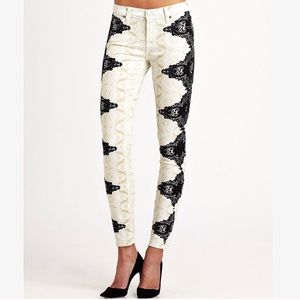 Gorgeous and super rare 7 for all mankind stretchy skinny jeans in a color block lace pattern print with tan, white, and black pattern. Still look brand new, only worn a couple times, perfect condition. Material is softer and stretchier than normal denim. Price is negotiable, I’m always open to fair offers. Kind of a cigarette style.