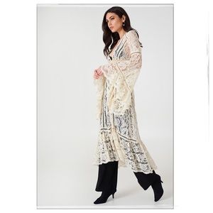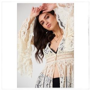 ✨Free People Rhiannon Ivory Lace Kimono✨ Amazing Sheer lace kimono in a long silhouette with an elegant, ethereal feel and retro-inspired flared sleeves✨ Slight high-low shape✨ Front hook-and-eye closures✨Stunning And Perfect For An Elegant Topper or Just As Great With Shorts And Tanks For Festival Season✨Sold Out On FP Website✨HighDemand and For This Beauty✨NWT✨Size Medium✨