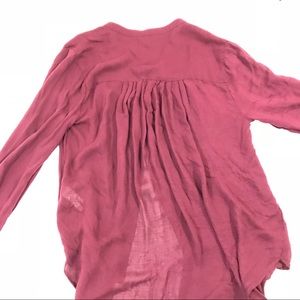 Lucky Brand sheer long sleeve button front rayon top. This lightweight rayon blouse has a loose fit and is billowy and bohemian. Maroon.