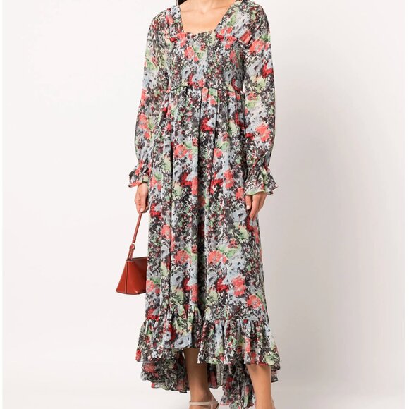 Elevate your wardrobe with the Leigh Dress by Cinq à Sept, a romantic and flowy floral-print maxi crafted in a dreamy sheer fabric. Featuring a smocked bodice for a flattering fit, ruffle-trimmed hem, and full long sleeves, this dress is perfect for garden parties, weddings, or a statement daytime look.