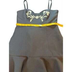This Cinq à Sept Dara Floral Embroidered Dress is a stunning dark navy blue cocktail piece featuring a sweetheart neckline and beautiful silver floral embroidery across the bust. The structured bodice smooths and flatters, while adjustable straps offer a comfortable, secure fit. A hidden side zip provides easy wear, and the dress flows into a playful inverted tiered ruffle skirt that moves beautifully with every step. Perfect for parties, dinners, and special events, this dress offers a polished, feminine silhouette with quality seaming and elegant detailing throughout. Colors and measurements may vary slightly due to lighting or screen settings.