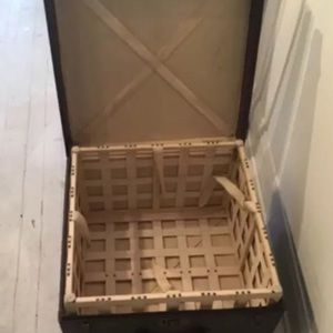 Vintage 1920s signature monogram Louis Vuitton webbed basket trunk hat box measuring 13” x 20” x 20” , next to original label # 743788. Please view all photos for condition