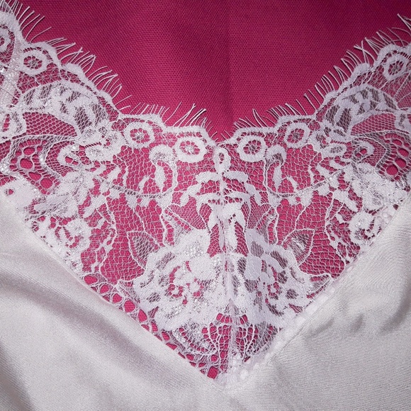 Cotton polyester blend slinky top with adjustable straps and slide hook clasp in the back of the neck, elastic waist and sheer lace mesh boyshort cut bottom. One piece step in. True to size. Hand wash lay flat to dry.
