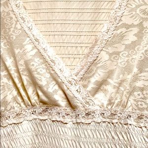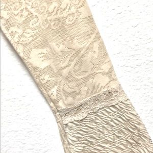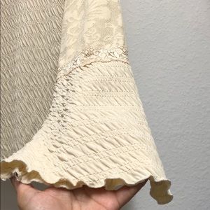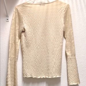 Beautiful Cream/Beige Blouse with a gorgeous neckline with a lace border, pretty bell sleeves and a delicate semi-lace pattern on the top half and f the blouse and top half of the sleeves. EUC. Shoulder width 15.5” and length 23”