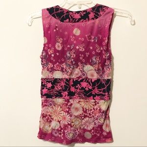 Magenta/multi; floral knit with bold contrast at neckline and waist; v-neckline; sheer, stretchy fabric; sleeveless; measurements: pit-to-pit is 13.5”, back length 21”, side 13”, and hem 13”; size M; made in Korea.