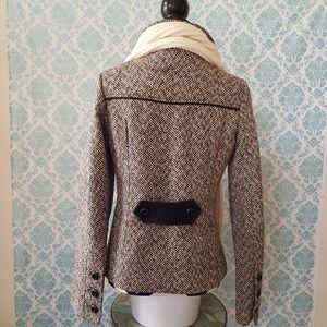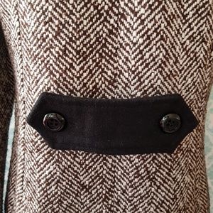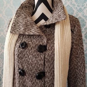 A fall and winter classic! Brown and cream colored, soft, warm peacoat by Miroa. Long sleeves, double button placket, vertical pockets below the waist, cropped style hits at hip, elegant and cozy. From a smoke-free home and in perfect condition.