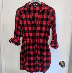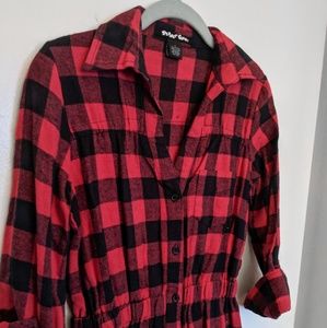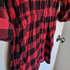 Red & black long sleeve plaid flannel shirt dress, cinched at waist with elastic. Can tie up sleeves with button closures. Black buttons and one front pocket.