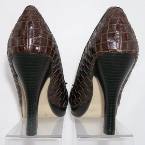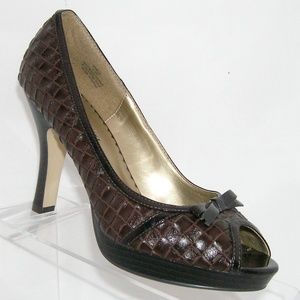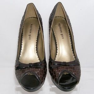 These Madden Girl shoes features all man made materials, peep toe, bow on vamp, weave design upper, cushioned insole, 3" width, and a 4" stacked heel with 0.5" platform. Slightly worn upper(scuffs), inner, insole(scuff), heel, and sole.