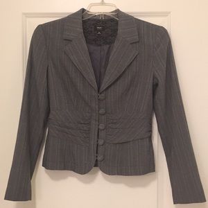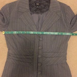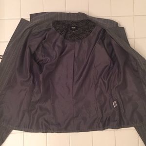 This gray career blazer has a very subtle white and light blue stripe pattern throughout. Beautiful 5 button closure with some nice detailed rusching near the bottom of the blazer. It’s lined on the inside. In wonderful condition as it’s only been worn a handful of times for short stints. Pair it with a skirt or dress pants for work, or jeans and heels for a casual yet classy look!
