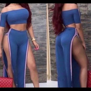 Splitting pants, cropped off the shoulder top. Red and White stripe details. The pants do not close!