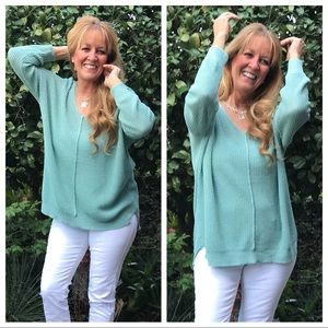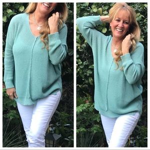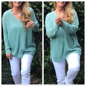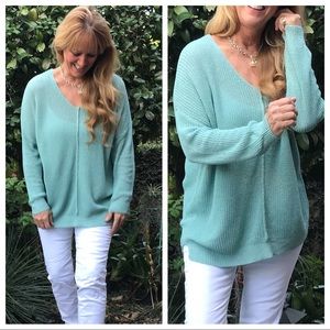 Knit sweater with a v-neckline and front seam in beautiful Spring color. Absolutely love the feel of this material.