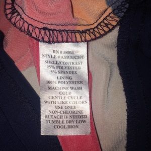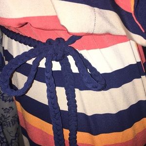 Excellent preowned condition flutter sleeve shift dress with rope tie waist in navy blue, beige , orange and red. Purchased from Macy’s. Length 35”, chest 18” with much room to go on top as it is designed to fit loose. String that holds belt in back is broken, but it is not needed to keep belt around waist. It is sewn on back as well.