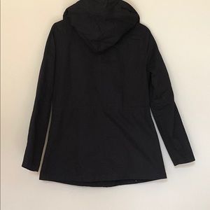 Cute black jacket with button details and hood. Purchased at a boutique, NWOT. Light weight but great coverage for the weather.