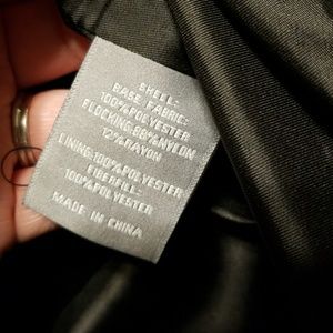 Picture from afar does not do this justice. Details are great. Feels like velvet and has a quilted look. Bottom and inside label has a nice straight line stiching detail. It breaks up the pattern. This coat is too cute. Silver assymetrical zipper