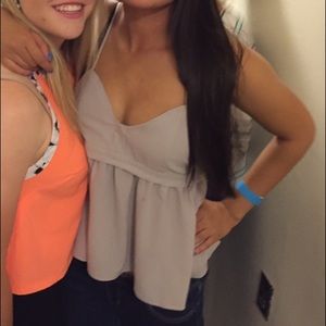 EUC - UO Kimchi Blue taupe/light lavender-gray silk tank top with sweetheart neckline and beautiful layered bottom + clasp metal back closure and open back detail. Size Medium on tag, but fits size small best :)