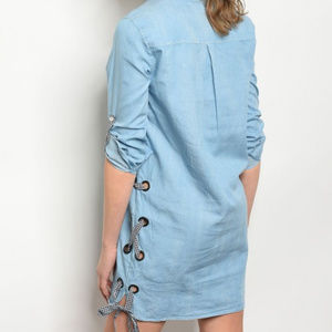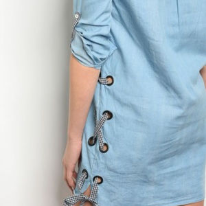 3/4 tab sleeve button down side gingham lace up denim shirt dress
