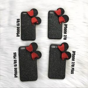 ♡ Minnie case is made out of a soft TPU black glitter case and features a red glitter felt bow with black glitter felt minnie ears.