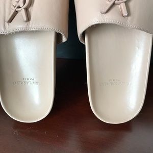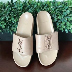 YSL Saint Laurent Joan slider sandals in nude. Size 37. Used with scuffing on sides of shoes and toes and heels of shoes. Also some marks on Footbed of shoes. Look closely at photos and please know your shoe size in this brand prior to purchasing. Thank you! These retail for 495$ and are still on shelves at Nordstrom. 💗
