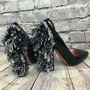 Meticulously crafted in Italy from black patent-leather, this pair has a covered block heel heavily embellished with scores of bugle beads, crystals and sequins. Make them the focal point of sleek tailored looks.