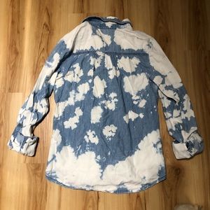 This acid washed denim button up top is in good condition. There are no noticeable holes stains. There are a few snags, one is pictures above but they are not very noticeable. The sleeves can be worn rolled up and buttoned or at full length. Feel free to comment with questions.