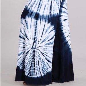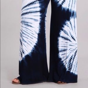 Navy tie dye palazzo pants with a fold-over waistband. Each item is hand-dyed for its unique character and American vintage laundered look and should expect variations in color and finishing. Super soft stretch material.
