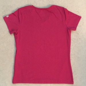 New without tags. Russell Athletic Ladies V-Neck Top. Comfortable lightweight top. Size Medium. 92% Polyester. 8% Spandex. WIDTH shoulder-shoulder 14in. Armpit-Armpit 18in. Hem 18in. Sleeve opening 5in. Collar opening 5in. LENGTH Shoulder-Hem 23in. Armpit-Hem 15.5in. Sleeve 5in. V-neck point 4in.