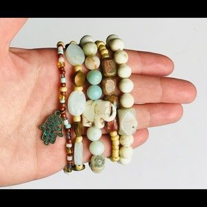 Materials: Glass Beads, Plastic Beads, Elastic, Ox Brass, Turquoise, Hematite, Jasper
