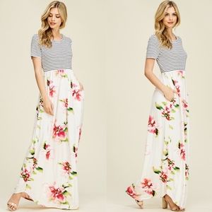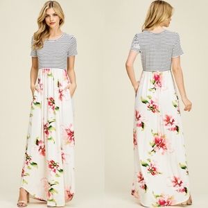 A short sleeve knit maxi dress with a round neck featuring striped top and floral bottom with side pockets.