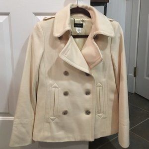 Heavy knit J.Crew sweater/cardigan. The buttons go all the way up so can be styled like a cardigan. There are some visible stains on the front (as pictured). Distinct wooden buttons on front. Two pockets in front. Great for layering/can be worn as a light jacket in the spring!