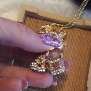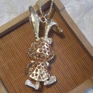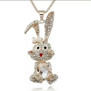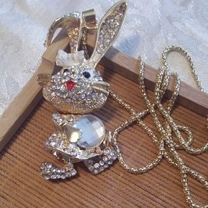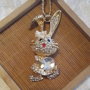 Rhinestone rabbit long chain necklace. Gold accented. Rabbit pendant is 3" long. Widest part is 1". 26" long gold chain.