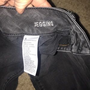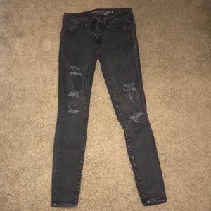 Black American Eagle black faded jeggings with distress holes.