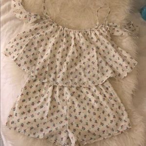 IVORY FLORAL ROMPER! Girly & Flirty Floral romper features a unique floral print all over, a round neckline and flounce layer on bodice. Item is also has a lining. This item just arrived and I only have 7 of these. Available in sizes small through large.