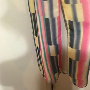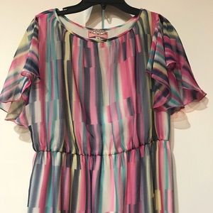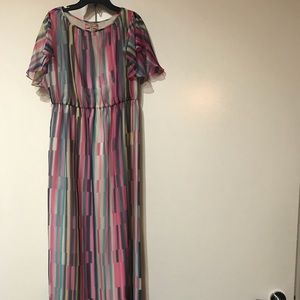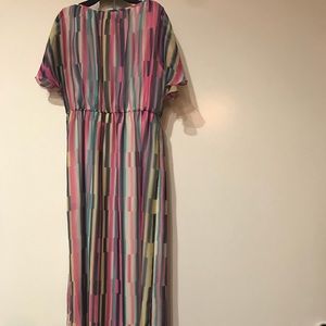Short sleeve maxi dress with pastel stripe colors, two short side slits, and pockets
