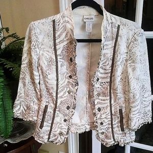 Nice lightweight open linen blend jacket by Chico's! Has very nice metal faux buttons in alternating gold and bronze. 3/4 sleeves.