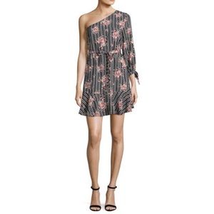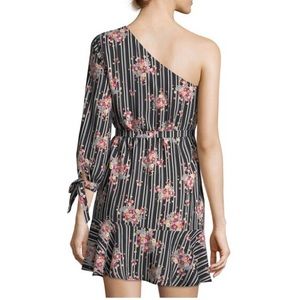 New from Neiman Marcus Collective Concepts one shoulder dress in floral and stripes print. Ties at the waist. Ruffle hem and an asymmetric neckline; sleeveless at right and three-quarter sleeve at left. Sold out at Neiman Marcus.