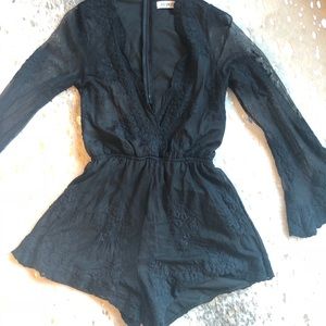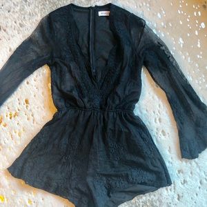 Reverse Black Deep-V romper with lace sleeves