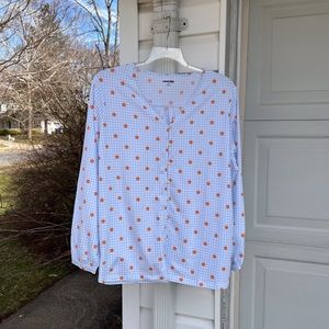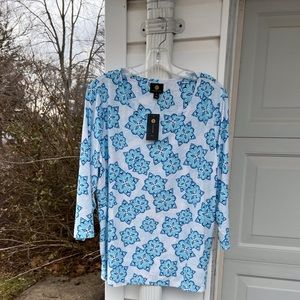 NWT Talbots Beautiful Blue with White Embroidery Cotton Blouse with Fun Hem, length is 27”. Originally $89.50. Enjoy!
