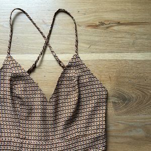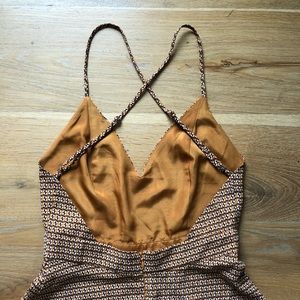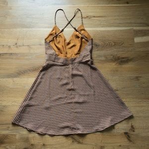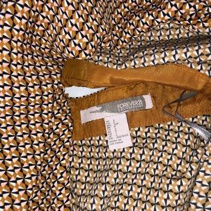 Forever 21 fit and flare dress with an orange / mustard geometric pattern. Features adjustable straps, a zipper at the back, and double lined fabric so it’s not see-through. Silky fabric makes this dress perfect for a hot summer day.