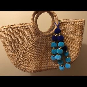 Stylish and classic straw tote with PomPom blue PomPom tassel
