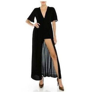 Structured Kimono Maxi Romper with Bell Sleeves and open back with self tieing belt that ties in the back.