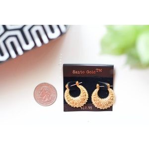 Gold colored rounded horse shoe-shape ornate hanging earrings. Quarter used to show size comparison. New without tag, in excellent condition The package doesn't say anything about sterling silver posts--best for those who do not have a metal sensitivity. Price is firm. No model. No trades. Bundle for discount.