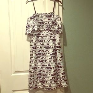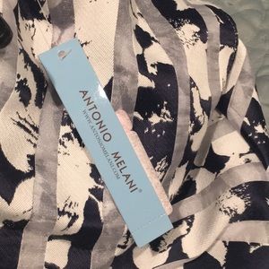 Perfect for the summer this Antonio Melani midi dress. Size 6, has a white slip on the bottom. It has stripes a clear one like see through and a navy blue with white flowers. Waist down it’s 25” and arm pit to arm pit is 16” wide. The price will be firm now is a new dress!