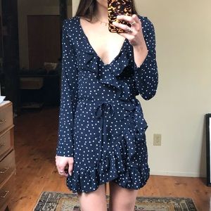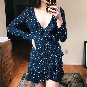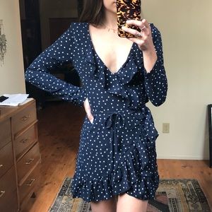 Brand new unbranded boutique item without tags. Chiffon polyester. Ruffled wrap dress with adjustable ties. Blue and white star print. I am a size 2 and 5 foot 8 wearing a small in the last 3 photos. Runs a bit small - especially length wise. Please note the measurements.