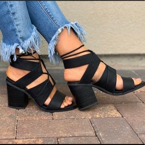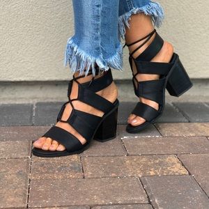 Black Strappy Lace Up Gladiator Block Heel Sandal