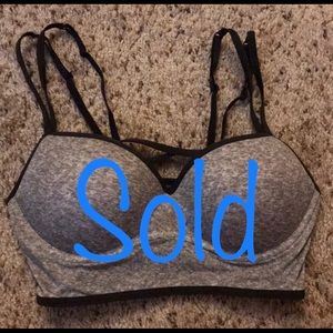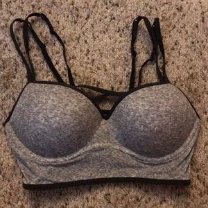 Super cute grey padded bra with dark grey X harness like straps across the top and lining the bra