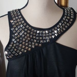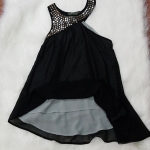Studded sleeveless top, shoulder cut out, hi low style. 100% polyester. Excellent condition.