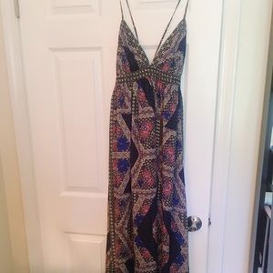 Strappy & fun, colorful maxi dress that criss-crosses in the back.